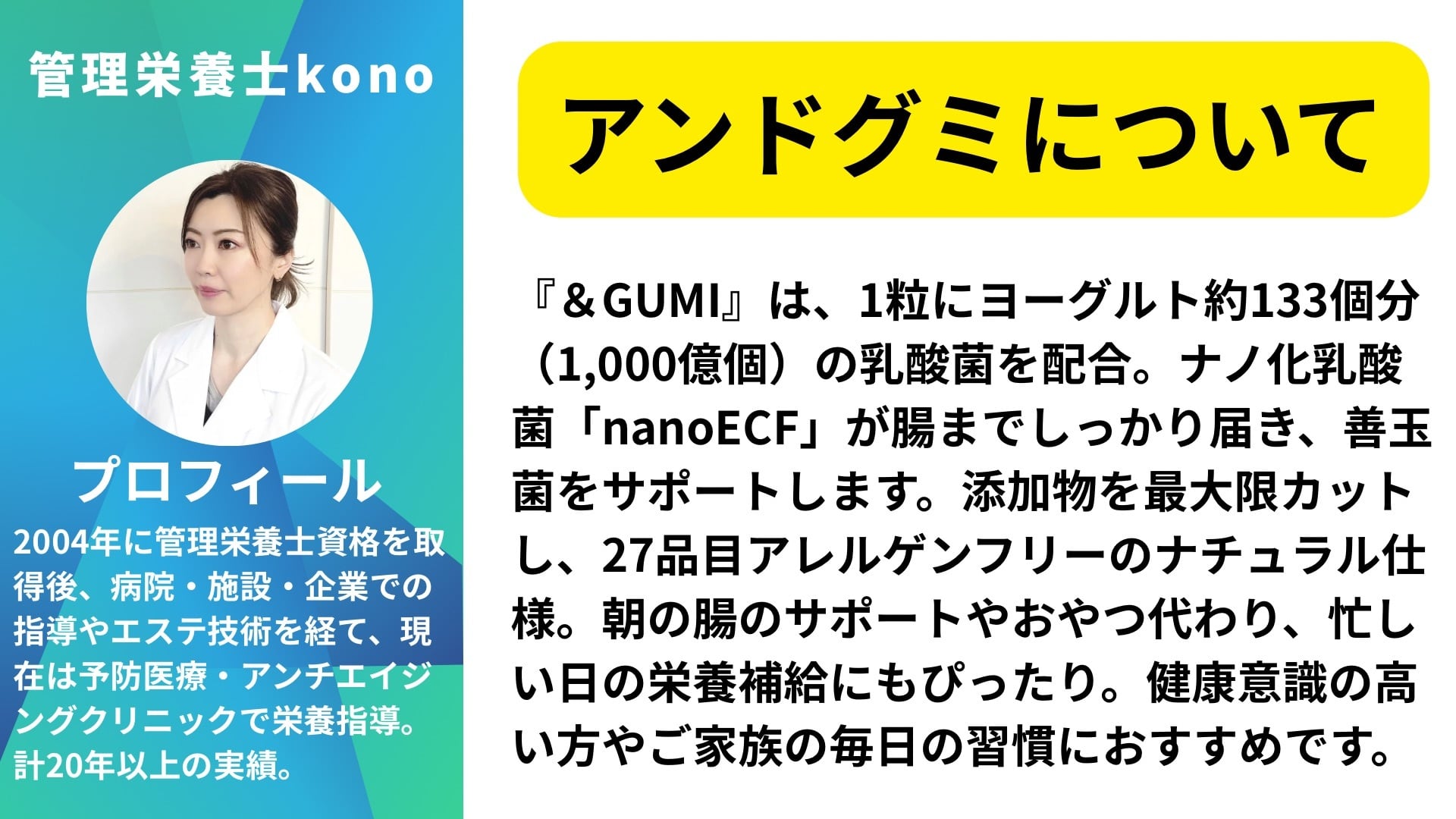 魅力的な美味しさと健康を両立した新しいおやつ、&グミが登場しました。乳酸菌1000億個を配合したこのヨーグルト味のグミは、毎日の健康をサポートするお菓子としてぴったりです。濃厚なヨーグルトの風味が口の中に広がり、食べるたびに楽しさを感じることができます。プルプルとした食感が特徴で、子供から大人まで楽しむことができる、家族みんなに愛される逸品です。このグミは、手軽に乳酸菌を摂取できるため、日々の健康維持や整腸を心がける方に最適です。